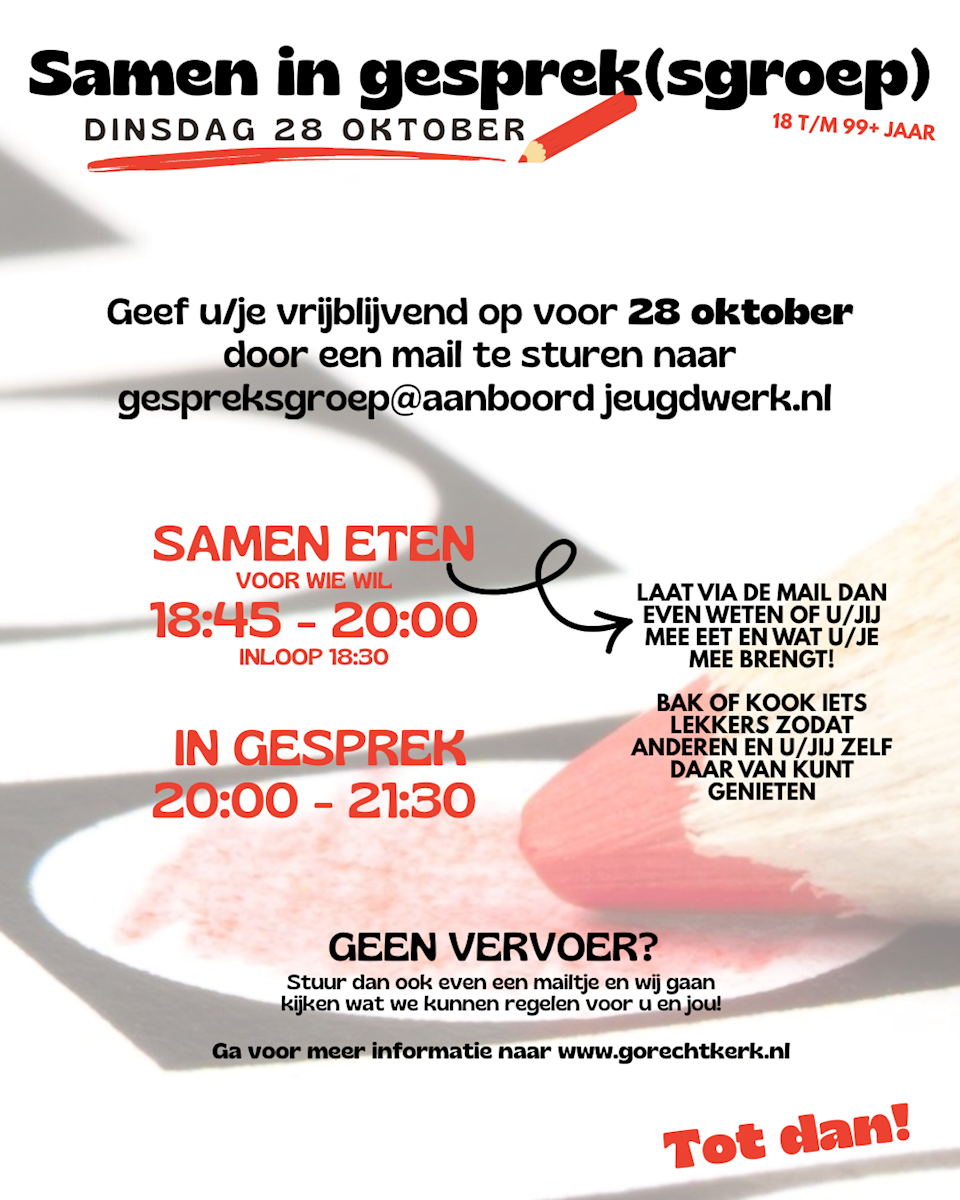 ![]() Na een hele mooie, eerste bijeenkomst is iedereen zo enthousiast dat de ‘Samen in Gesprek(sgroep)’ blijft! Van 20:00 – 21:30 hebben we een mooie avond met elkaar! U en jij bent ook weer van harte uitgenodigd om, vóor de gespreksgroep aan, met elkaar te eten. Vanaf 18:30 bent u/jij welkom en we starten om 18:45 met de maaltijd. De vorige keer aten we onder anderen wraps, pasta’s, taart en brownie. Bak of kook iets lekkers waar u en jij van kunt genieten. Neem niet meer mee dan voor twee personen, jammer als we eten overhouden. Mee eten? Geef u/je vrijblijvend op voor 28 oktober door een mail te sturen naar gespreksgroep@aanboordjeugdwerk.nl en laat in de mail even weten wat u/jij meeneemt!🥗 Datum: Dinsdag 28 oktober Tijden: Eten: 18:30 – 20:00 Gesprek: 20:00 – 21:30 Waar: Gorechthuis Tot dan!✨ Groetjes de gespreksgroep 18-30 jaar | ||